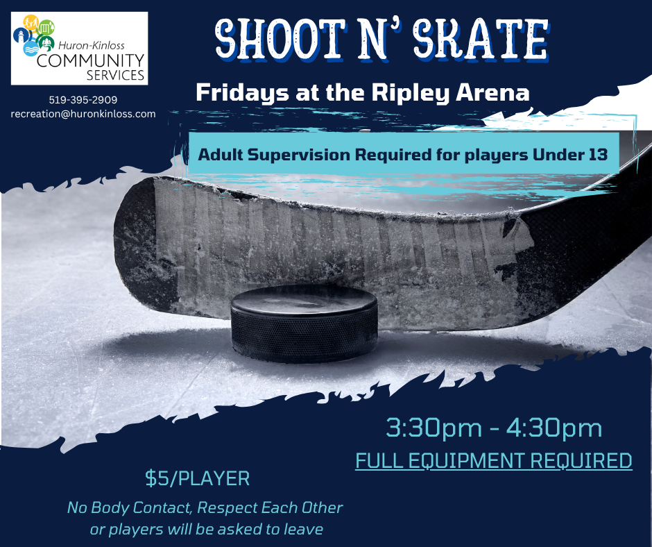 Shoot n' Skate is held Friday afternoons at the Ripley-Huron Community Centre. This program is offered to support youth in developing hockey skills by working on their hockey shots on the net. This is not shinny or pick up hockey. Please be respectful of all ages on the ice.