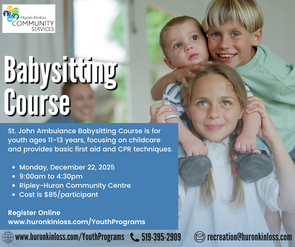Huron-Kinloss Community Services is hosting a St. John Ambulance Babysitting Course on Monday, December 22.This course is for recommended for ages 11-13 years old, focusing on childcare and provides basic first aid and CPR techniques.
