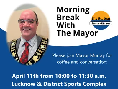 Morning Breaks with the Mayor are back! Please join us for a casual conversation with Mayor Murray April 11th in Lucknow, June 20th in Point Clark, and October 17th in Ripley from 10 a.m. to 11:30 a.m. No decisions will be made at these events.