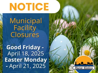 The Municipal Office and Ripley-Huron Community Centre will be closed Friday April 18th and Monday April 21st. The Huron Landfill will be closed Friday April 18th and Saturday April 19th. Please plan accordingly.
